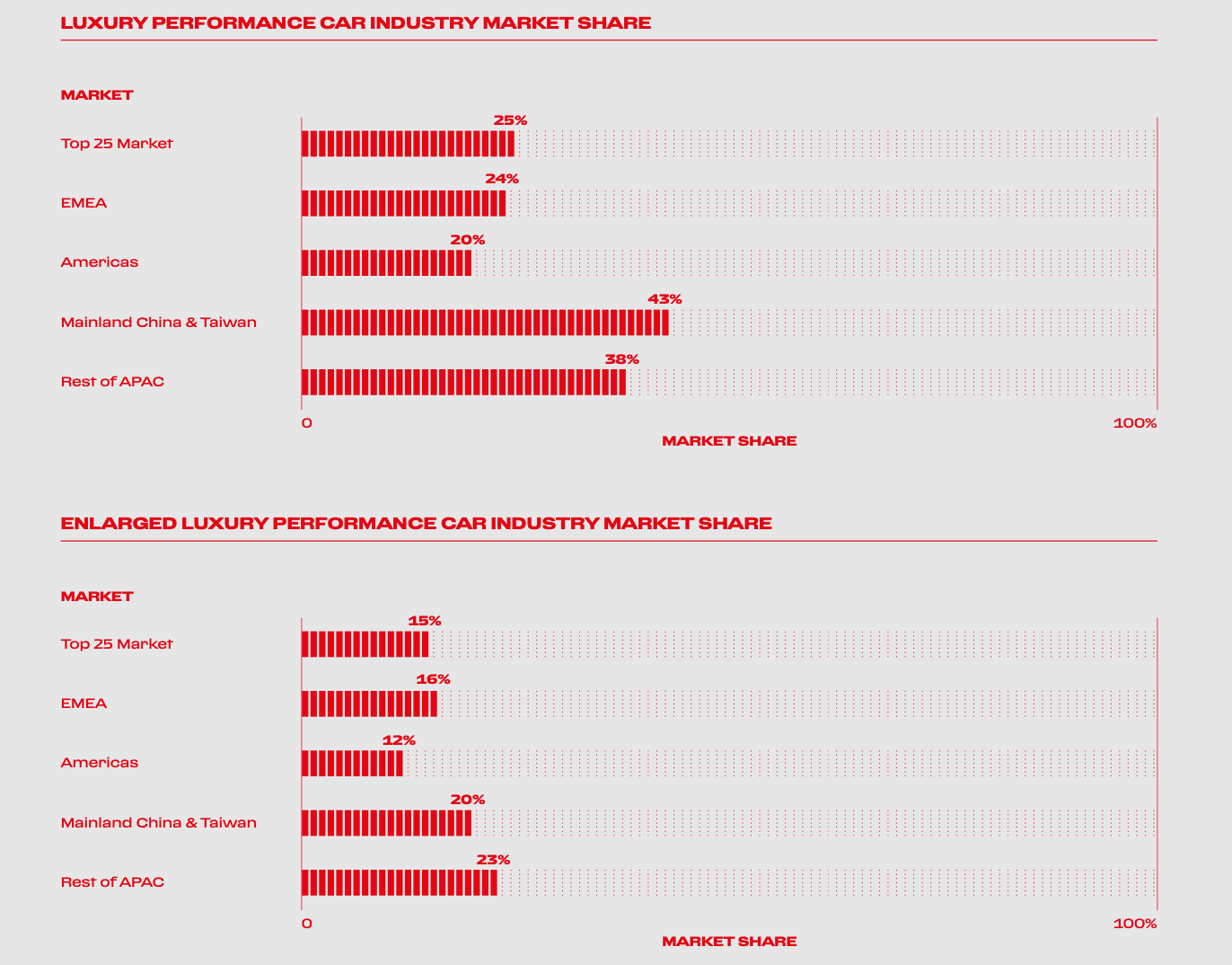 Ferrari holds a market share of 25% and 15%, though this may decline in the near future as Ferrari intentionally limits its production volume and does not aim to increase shipped units.