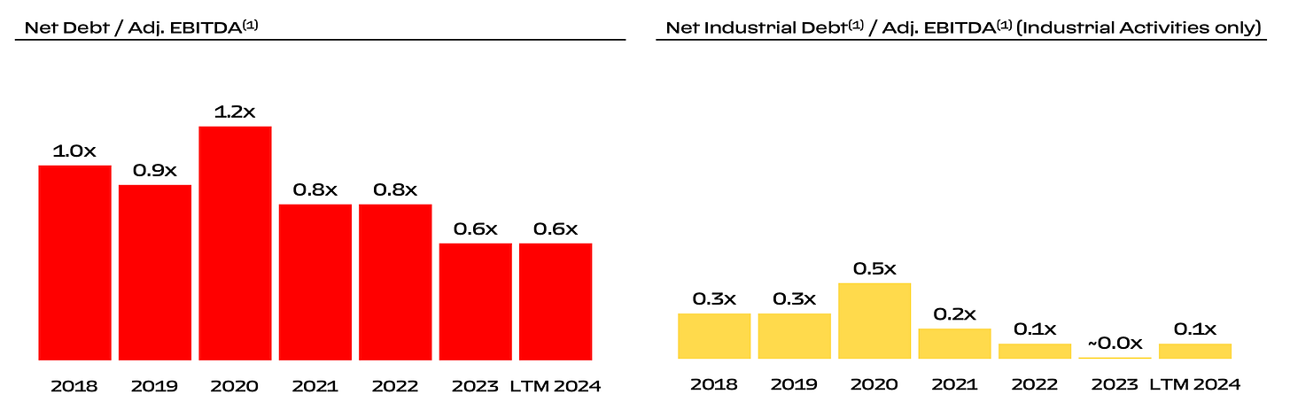 Below, you can see Ferrari’s debt ratios. The company holds nearly €1.5 billion in cash, while its Industrial Free Cash Flow (FCF) reached €364M in Q3 2024, up €63M YoY. Additionally, Net Industrial Debt decreased from €441M to €246M, so Ferrari’s financial position is healthy. Unlike many companies, Ferrari does not dilute shareholders - instead, it actively buys back shares.