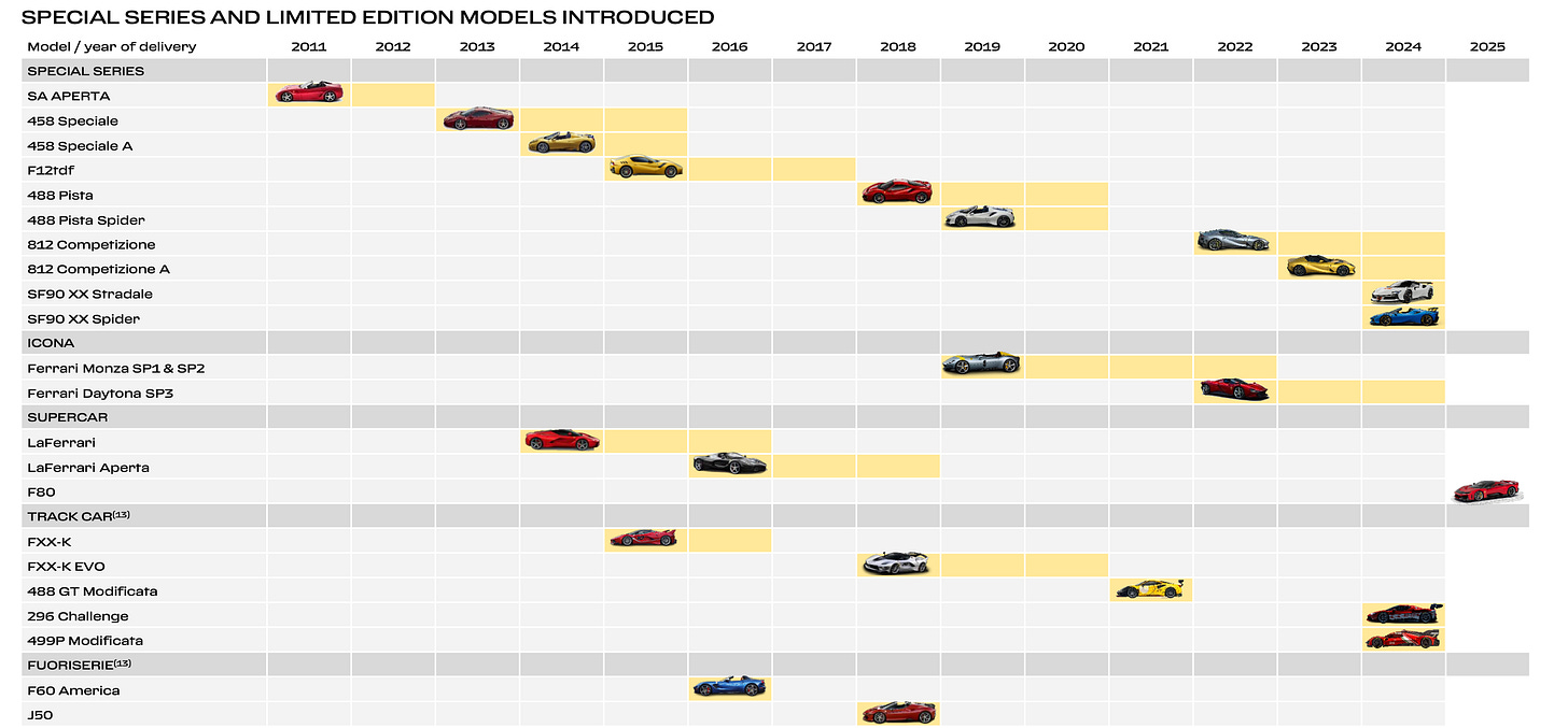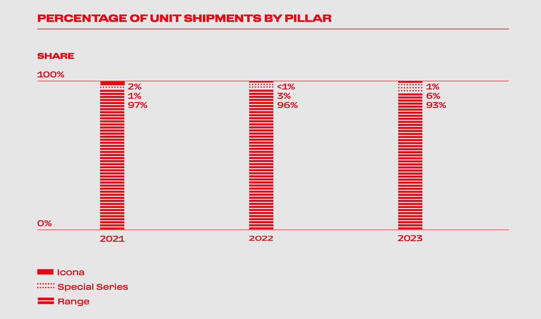 Ferrari’s product lineup consists of different categories, each serving a specific purpose. To put it into perspective, in 2023, more than 90% of units shipped fell into the Range Model pillar, but that number is declining!
