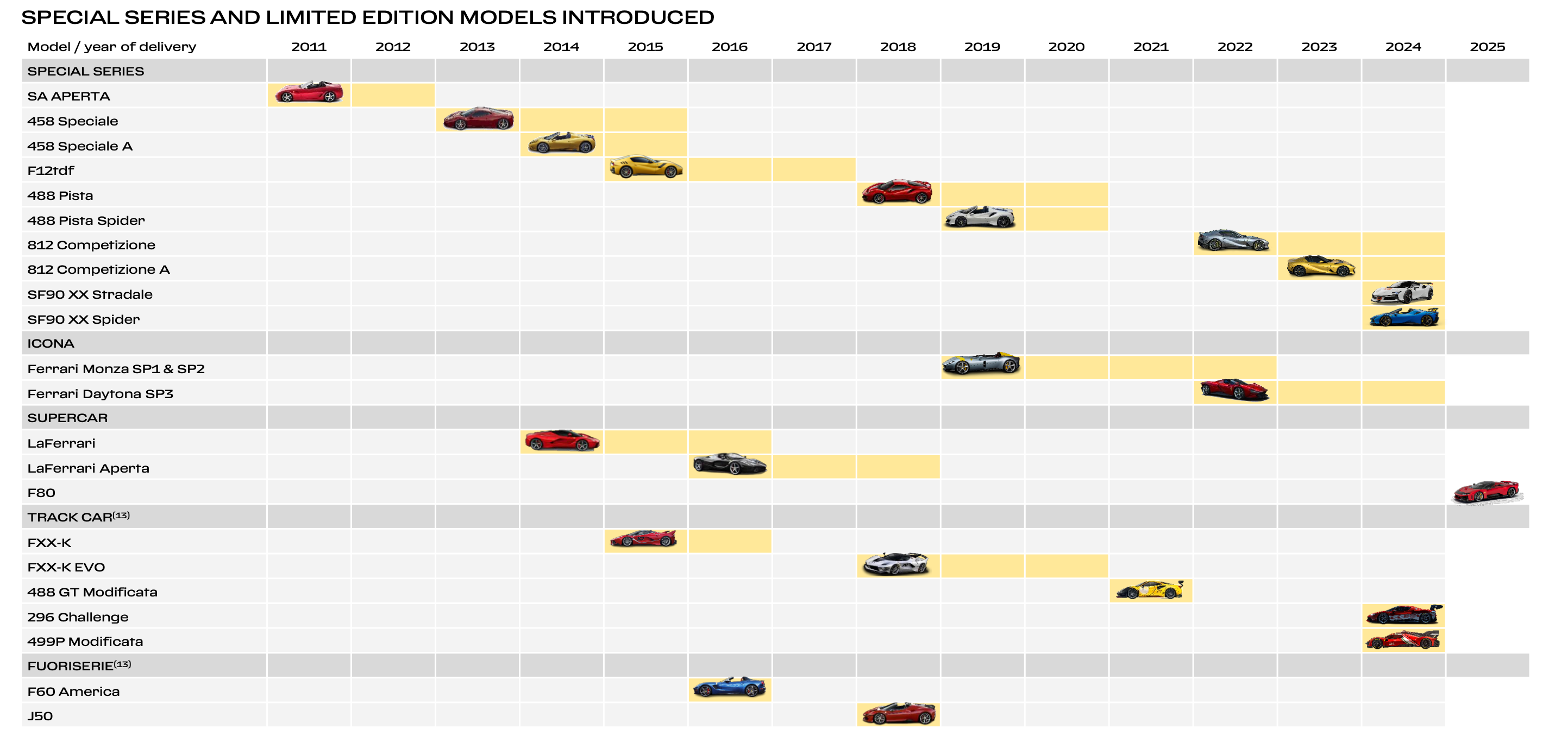 Supercars serve as Ferrari’s flagship models and are released only on rare occasions, sometimes with many years between launches. The most recent example, the LaFerrari Aperta, was introduced in 2016 (only 210 units were produced). These cars showcase Ferrari’s most advanced technology and represent the pinnacle of its performance capabilities.