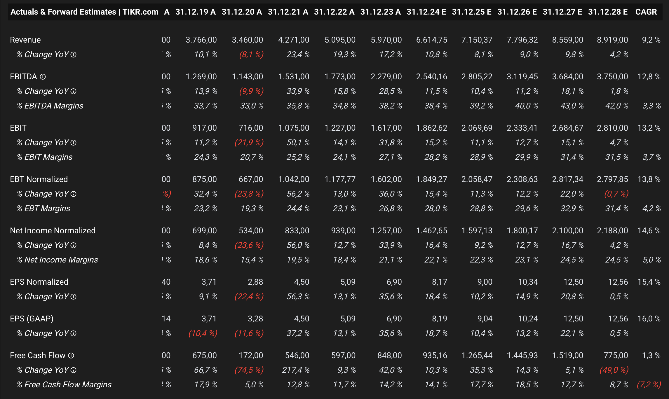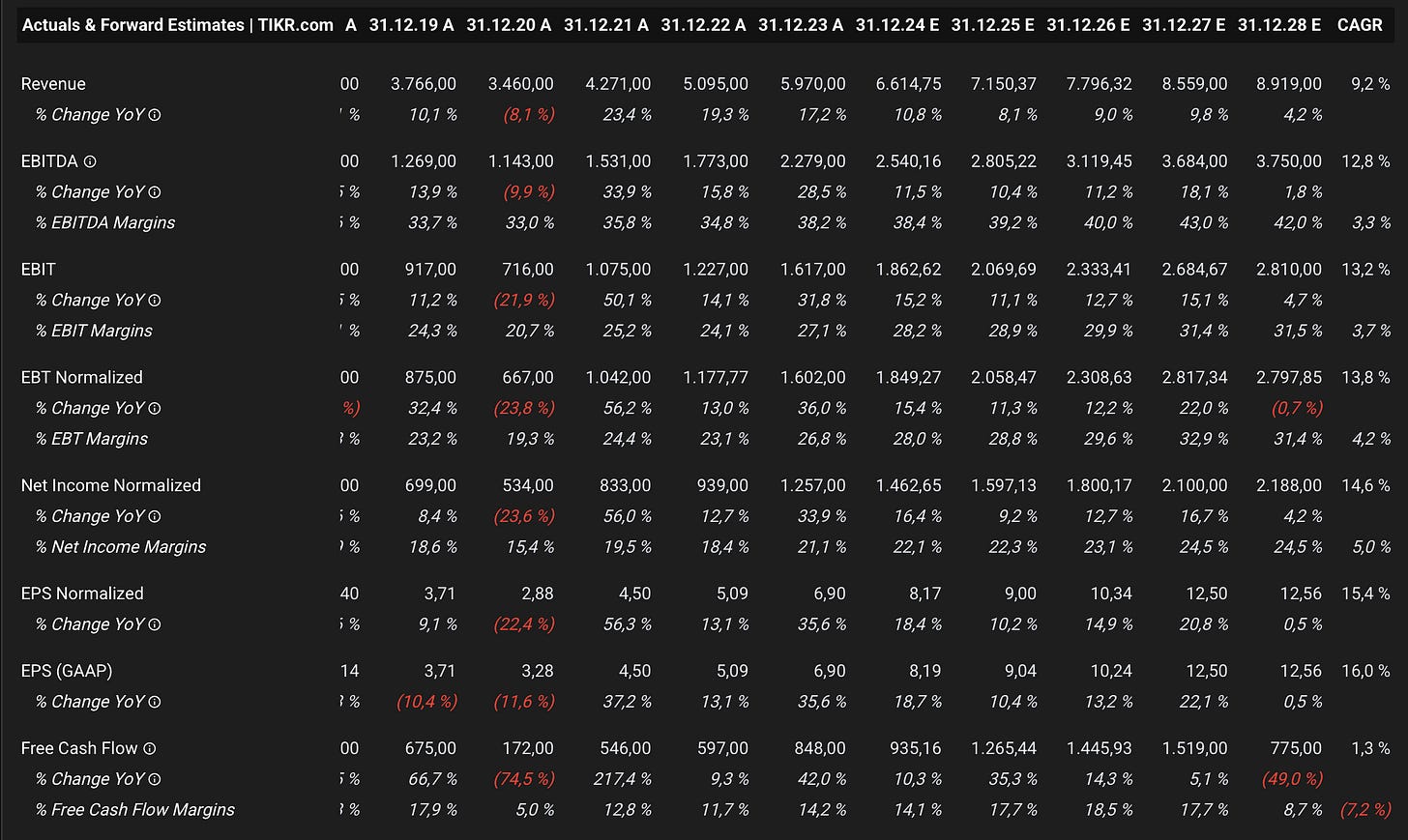 If Ferrari maintains a P/S ratio of 10.5, the upside would be roughly 30% until 2028. Additionally, if we assume Ferrari trades at a 38x forward earnings multiple and achieves its target EPS of €12.56, the stock would be valued at around €460—leaving almost no upside.